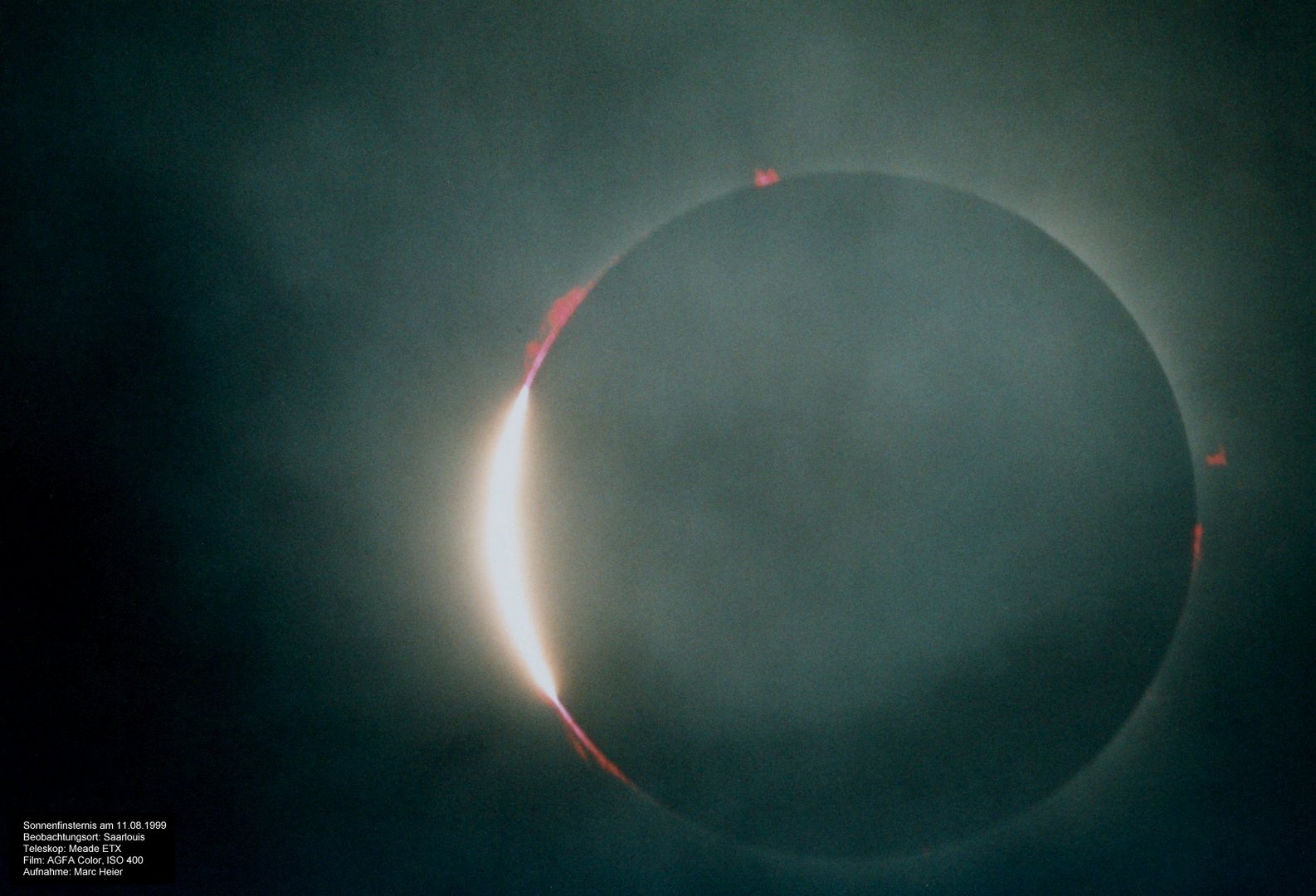 Home sonne & mond finsternisse 11. Die untenstehenden bilder zeigen den weg des mondschattens über europa. Für astrofans war das jahr 1999 etwas ganz besonderes. Im jahr 1999 hatte ich das besondere glück, die sonnenfinsternis am 11.08.1999 in deutschland in der nähe von münchen erleben zu dürfen. Meine fotografien, aufgenommen in der nähe von karlsruhe mit unterschiedlichen belichtungszeiten, zeigen protuberanzen und korona sowie diamantring. Die sonnenfinsternis 1999 verspricht auch in der schweiz ein spektakel zu werden. Die belege sind mit unterschiedlichen phasen der sonnenfinsternis illustriert und tragen. Natürlich wollte ich sie live miterleben. Partielle mondenfinsternis & totale sonnenfinsternis 21.08.2017. Die sonnenfinsternis am 11.08.1999 im rückblick. Das nächste derartige himmelspänomen wird in österreich nicht vor dem jahr 2081 sichtbar sein. Mein persönliches erleben der totalen sonnenfinsternis am 11.08.1999 in der nähe von salzburg(österreich).my personal experience of the total eclipse at. Jump to navigation jump to search.